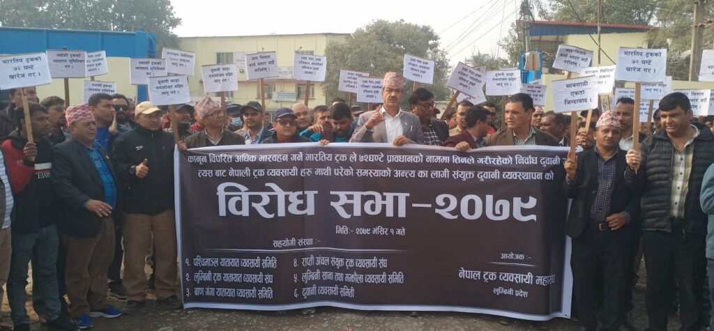 पश्चिमाञ्चल यातायात व्यवसायी समिति, लुम्बिनी ट्रक यातायात व्यवसायी संघ, बाणगंगा यातायात व्यवसायी समिति, राप्ती अञ्चल संयुक्त ट्रक व्यवसायी संघ, लुम्बिनी साना तथा मझौला व्यवसायी समिति र ढुवानी व्यवसायी समितिले संयुक्त रुपमा भैरहवा भन्सार कार्यालय अगाडी बिरोध सभा गरेका छन् । भारतीय ओभरलोडका कारण नेपाल तर्फ सडक, पुल लगायतका भौतिक संरचनाको क्षति मात्र नभई आफ्नो पेशा नै संकटमा पर्न थाले पछि उनीहरुले आन्दोलनको विकल्प नरहेको बताएका छन् । नेपाल सरकारले भारतीय ओभरलोड गाडीहरु ब्यवस्थापन गर्नुपर्ने र यसो नगरे एक मुठी पनि भारतीय ओभरलोड रहेका समान नेपाल छिर्न नदिने चेतावनी दिएका छन् ।