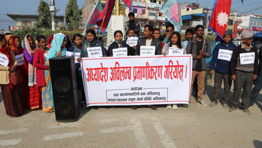 टीकापुर घटनामा जन्मकैदको सजाय भोगिरहेका रेशम चौधरीलाई छुटाउन सरकारले ल्याएको अध्यादेश प्रमाणीकरणको माग गर्दै कपिलवस्तुको चारनम्बरमा प्रदर्शन गरिएको छ ।