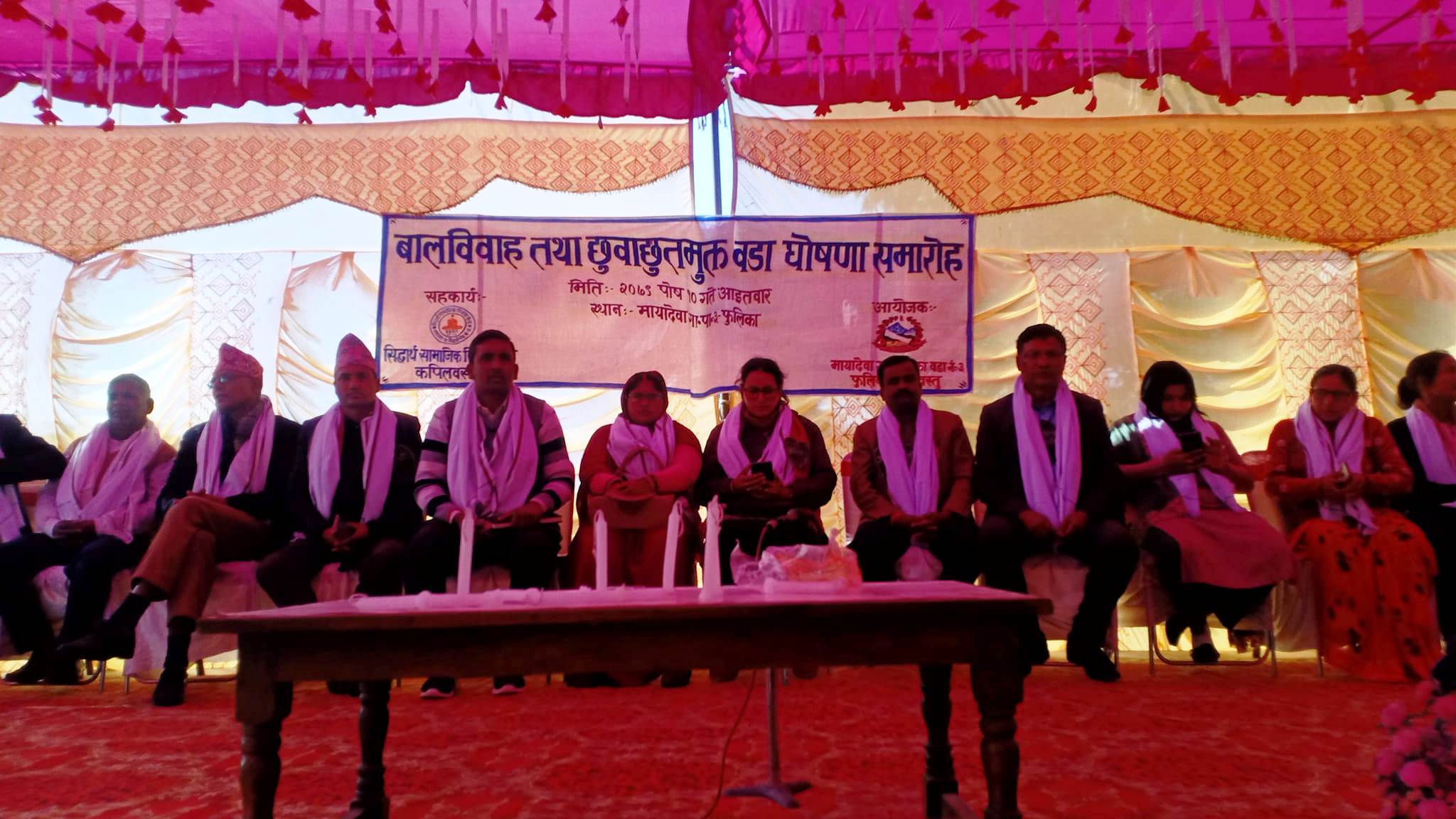 घोषणा समारोहमा प्रमुख अतिथी भौतिक पूर्वाधार विकास मन्त्री सहसराम यादवले कानुनी र सामाजिक अपराधको रुपमा रहेको बालविवाह तथा छुवाछुत समाजको वाधक बनेकोे बताए । उनले बालबालिकाको सर्वाङ्गिण विकासका लागि बालविवाह अन्त्य हुनुपर्नेमा जोड दिए । मन्त्री यादवले अझै पनि कपिलवस्तु जिल्ला शिक्षामा पछाडी परेकाले पालिकाहरुले शिक्षाको माध्यमबाट समाजमा चेतना फैलाउनुपर्ने बताए । अर्थ राज्यमन्त्री शुष्मा यादवले महिला बालबालिकाहरुको सशक्तिकरणको क्षेत्रमा सवै निकायले मिलेर काम गर्नुपर्ने बताइन् ।