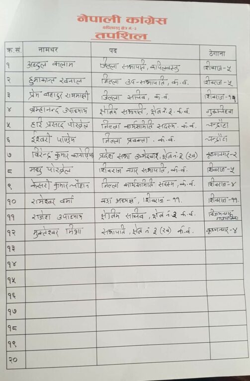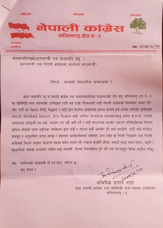 केन्द्रीय सभापति शेर बहादुर देउवालाई एक पत्र लेख्दै शाहले जिल्ला सभापतिसहित १२ जना नेतालाई कारबाही गर्न माग गरेका हुन् ।