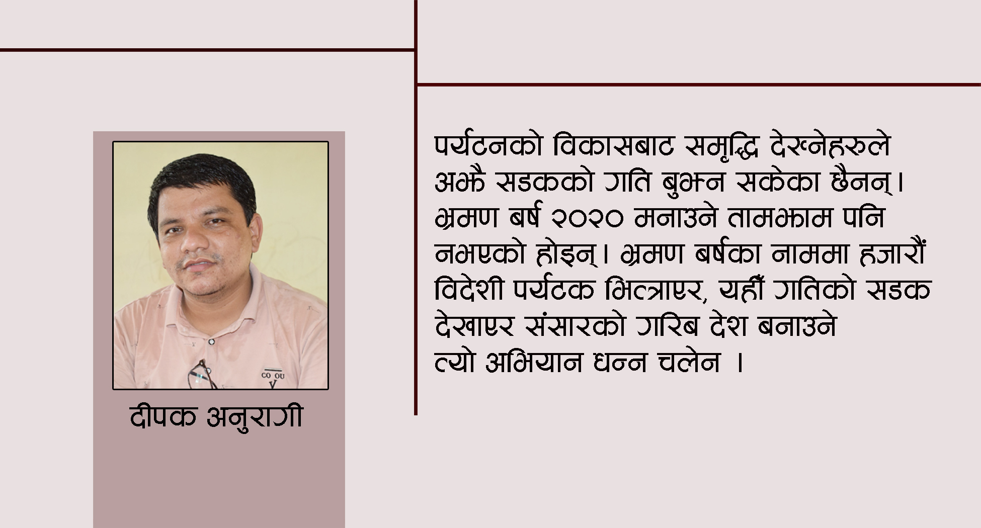जति धेरै प्राकृतिक बनोटले मनलाई चुङ्ग्याएको थियो । उत्तिकै सडकको दुर्दशाले देश हाक्ने नेता र कर्मचारीलाई गिज्याएको थियो । प्रकृतिले अपार सम्भावना दिँदा दिदैं यसको अर्थ बुझ्न नसक्नु नै हाम्रो विडम्वना बनेको छ ।