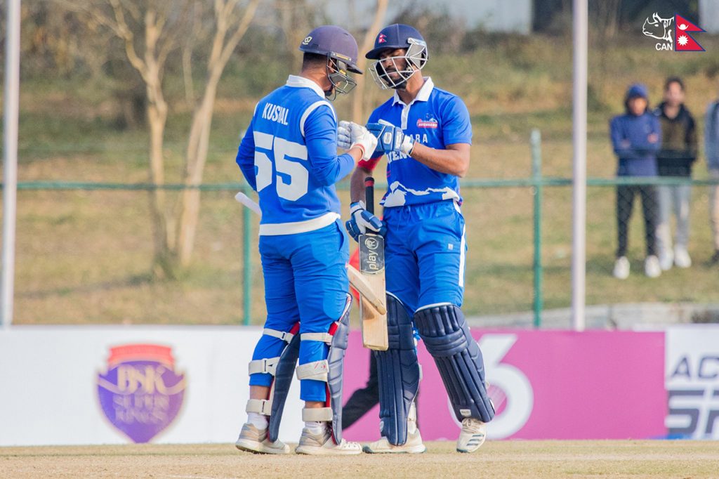 कुशलले २२ बलमा ५ छक्कासहित ४० रनको योगदान गरे । सिद्धान्तले १० बलमा १ चौका र २ छक्कासहित २३ रन बनाए । अमिर हम्जाले १२ रन जोडे ।