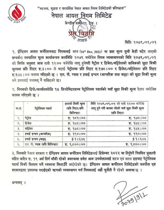 अहिले मट्टितेलबाहेक सबै पेट्रोलियम पदार्थको मूल्य बढेर आएको भए पनि नेपालमा भने नबढाइएको निगमले जनाएको छ । अहिले पेट्रोलको मूल्य प्रतिलिटर एक सय ७८ तथा डिजल र मट्टितेलको मूल्य प्रतिलिटर एक सय ७५ रुपैयाँ रहेको छ । त्यस्तै खाना पकाउने ग्यासको मूल्य प्रतिसिलिन्डर एक हजार आठ सय रुपैयाँ रहेको छ ।