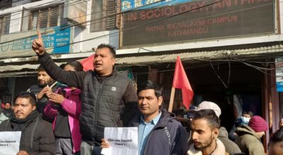 काठमाडौं ।अनेरास्ववियूले शिक्षामन्त्री शिशिर खनालको विरोध गर्दै पुत्ला जलाएको छ। शुक्रबार काठमाडौंको प्रदर्शनीमार्गस्थित आरआर क्याम्पसअगाडि