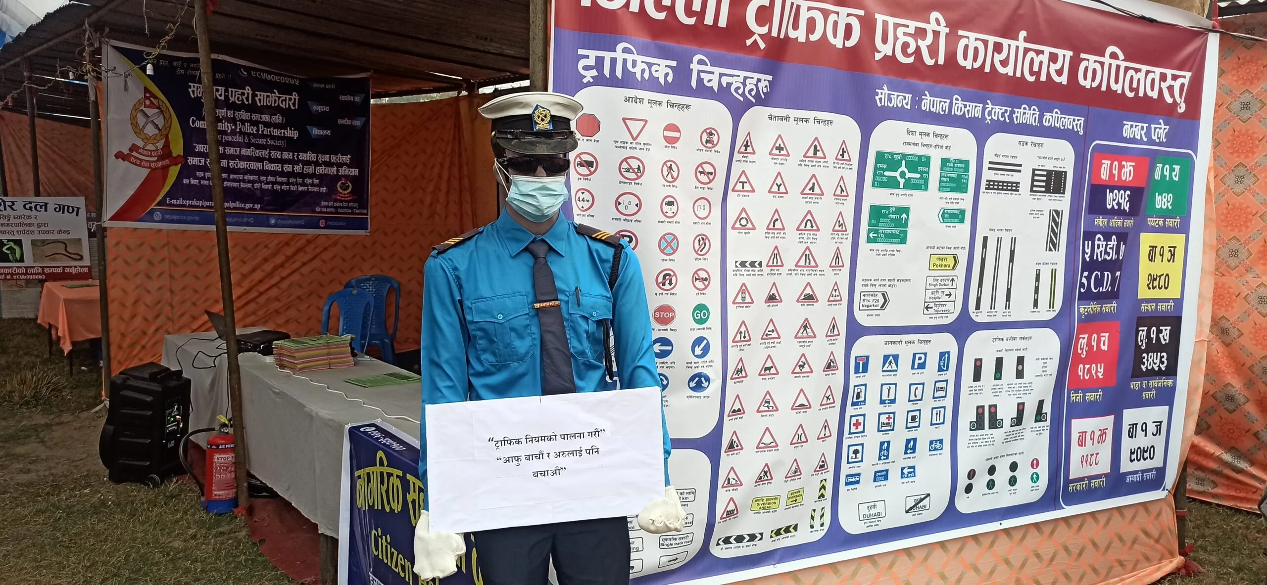 तर त्यो सजिव मान्छे नभएर ‘डमी प्रहरी’ हो । जसले ‘ट्राफिक नियमको पालना गरौँ, आफू बाँचौँ र अरुलाई पनि बचाऔँ’ नामक सचेतनामूलक सन्देश लेखिएको सेतो प्लेकार्ड समातेर उभिरहेको छ । कपिलवस्तु महोत्सव अवलोकन गर्ने दर्शकहरुलाई दैनिक रुपमा त्यसले ट्राफिक नियम सिकाइरहेको छ ।