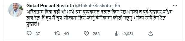 सामाजिक सञ्जालमा ट्वीट गर्दै उनले त्यस्तो भनेका हुन् । नेता बास्कोटाले लेखेका छन्, “अस्तिसम्म विदा बढी भयो भन्थे प्रम पुष्पकमल दाहाल प्रचण्डले, किन रैछ भनेको त पूर्व देखाएर पश्चिम हान्ने रैछ । मौकामा हिरा फोर्नु बेमौकामा कौडी नछुनु भनेको त्यसै हैन रैछ भनेका पुर्खाले ।”