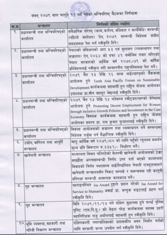 बैठकले राष्ट्रिय योजना आयोगका उपाध्यक्ष मीनबहादुर श्रेष्ठलाई थाइल्यान्डमा हुने दिगो विकाससम्बन्धी दशौँ एसिया प्यासिफिक फोरममा सहभागी हुन स्वीकृति दिएको छ भने विकास आयोजनाको सञ्चालन तथा व्यवस्थापन गर्ने सम्बन्धी विधेयक तर्जुमा गर्न सैद्धान्तिक स्वीकृत दिएको छ ।