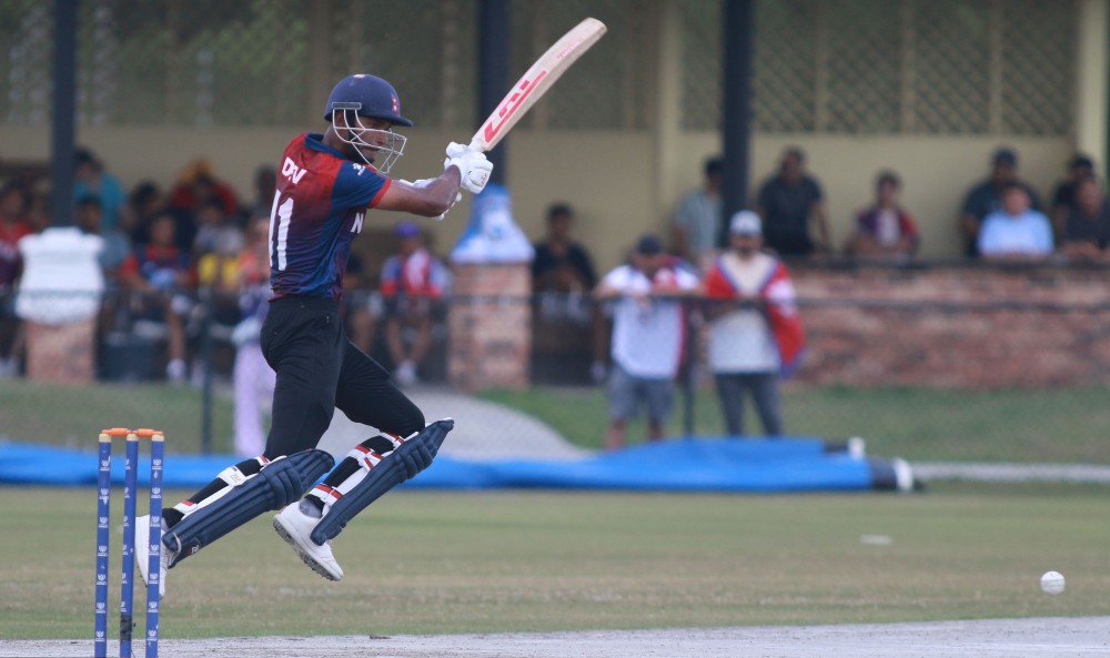 यसअघि आकाश त्रिपाठी र विशालविक्रम केसी अर्धशतक बनाएपछि नेपालले मजबुत स्कोर बनाएको थियो । आकाशले १ सय बल खेल्दै ७ चौका र १ छक्का प्रहार गरी ७८ रन बनाए । उनी ३४ औं ओभरमा आउट भएका थिए, जतिखेर नेपालको स्कोर १ सय ४५ रन थियो । दीपक बोहरा ‘ए’ ५ रनमा आउट भएपछि आकाशले अर्जुन कुमालसँग दोस्रो विकेटमा ९३ रनको साझेदारी गरे । अर्जुनले ६७ बल खेल्दै ३ चौकासहित ३७ रन बनाए ।