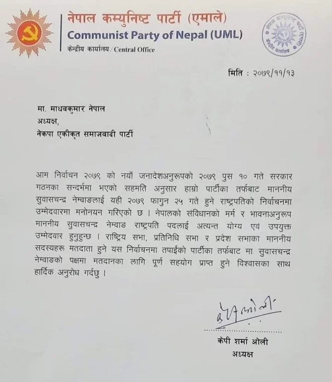 नेकपा एमालेका अध्यक्ष केपी शर्मा ओलीले राष्ट्रपतिको निर्वाचनमा सुवास नेम्वाङलाई भोट दिन आग्रह गर्दै एकीकृत समाजवादीका अध्यक्ष माधव नेपालाई पत्र पठाएका छन् ।