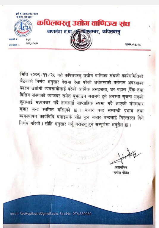 कपिलवस्तु उद्योग बाणिज्य संघले एक सूचना जारी गर्दै मंगलबार हुँदै आएको साप्ताहिक बजार खुल्ला भएको घोषणा गरेको हो ।
