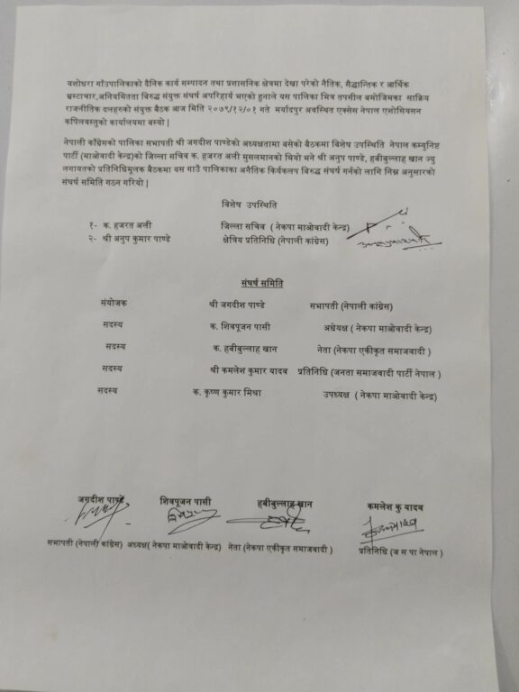 नेकपा (माओवादी केन्द्र) कपिलवस्तुका सचिव हजरत अली, नेपाली कांग्रेसका क्षेत्रिय प्रतिनिधि अनुप कुमार पाण्डेको विषेश उपस्थितिमा बुधबार पालिका विरुद्ध एक संघर्ष समितिको घोषणा गरिएको छ ।