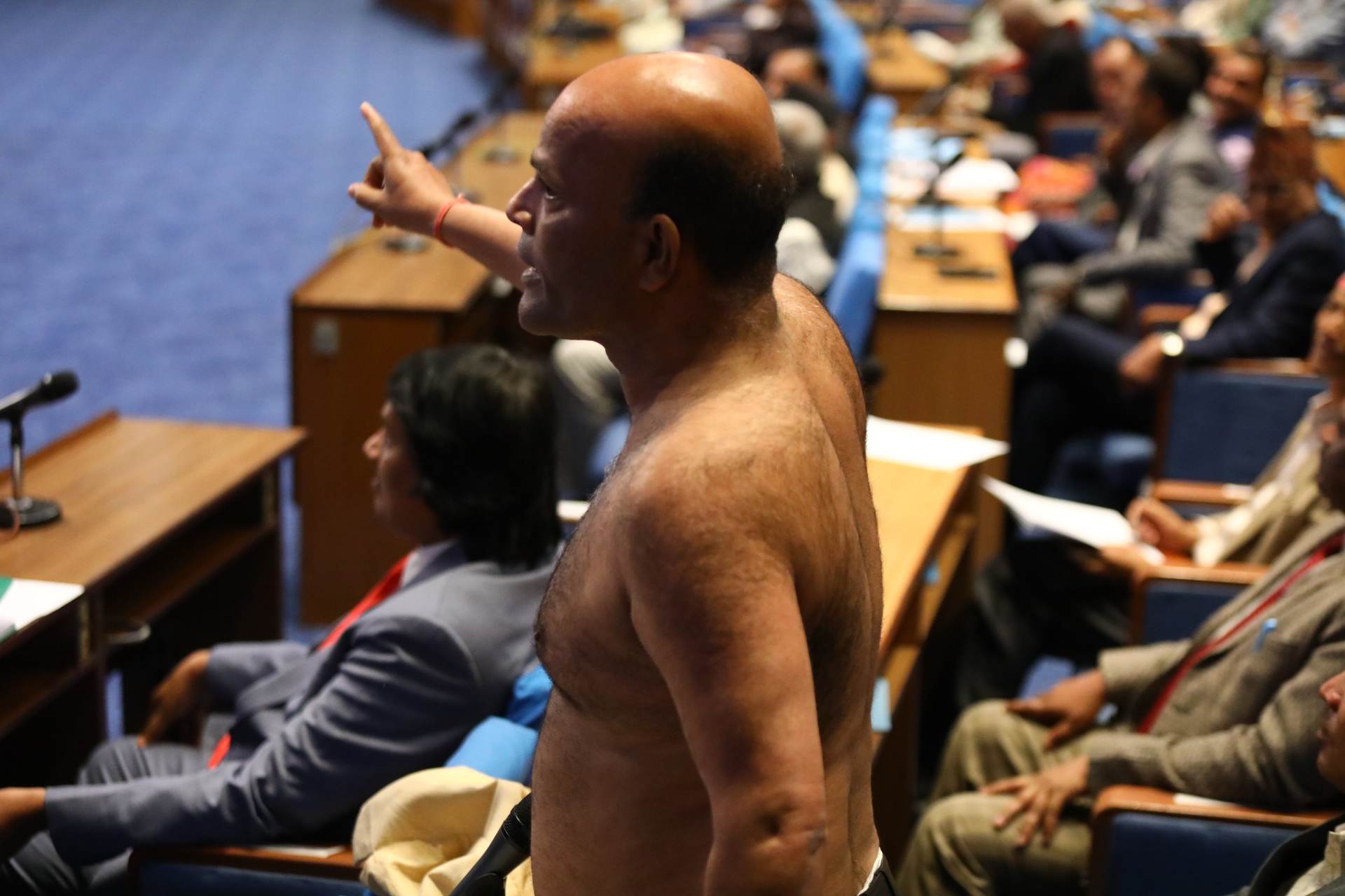 एकछिनमा कमिज फुकालेका उनले फेरि भित्रको पेटीगञ्जी पनि फुकालेर नाङ्गै भए । सभामुख घिमिरे केही अल्मलिएको देखियो । अनि सभामुखले उनलाई मर्यादा ननाघ्न पटक–पटक चेतावनी दिए । उनलाई बैठकबाट निस्कासन गर्ने आँट भने देखाएनन् । सभामुखले पटक–पटक मर्यादित हुन आग्रह गरेपछि उनी बसे ।