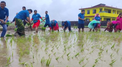 म्याग्दीको बेनी नगरपालिका–५ पुलाचौरको फाँटमा रोपाइँ गर्दै गरेका स्थानीय बासिन्दा । पर्याप्त वर्षा नभएका कारण
