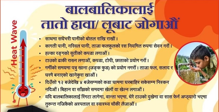 बालबालिकाको साथमा पानीको बोत्तल सधैँ राख्न र उनीहरुलाई कागती पानी, नरिवल पानी, ताजा फलफूलको रस नियमित रुपमा खुवाउन भनिएको छ ।