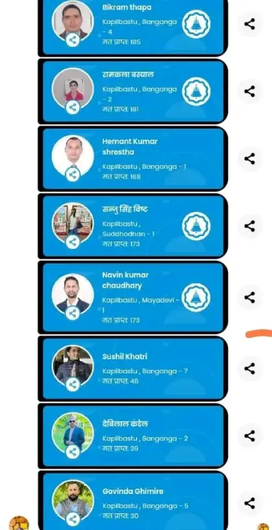 थापा र बस्यालसहित शुद्धोधन गाउँपालिकाका सञ्जुसिंह बिष्ट र मायादेवी गाउँपालिकाका नवीन कुमार चौधरीले समान १७३ र बाणगंगाका हेमन्त कुमार श्रेष्ठ १६८ मत ल्याएर विजयी भएका छन् ।