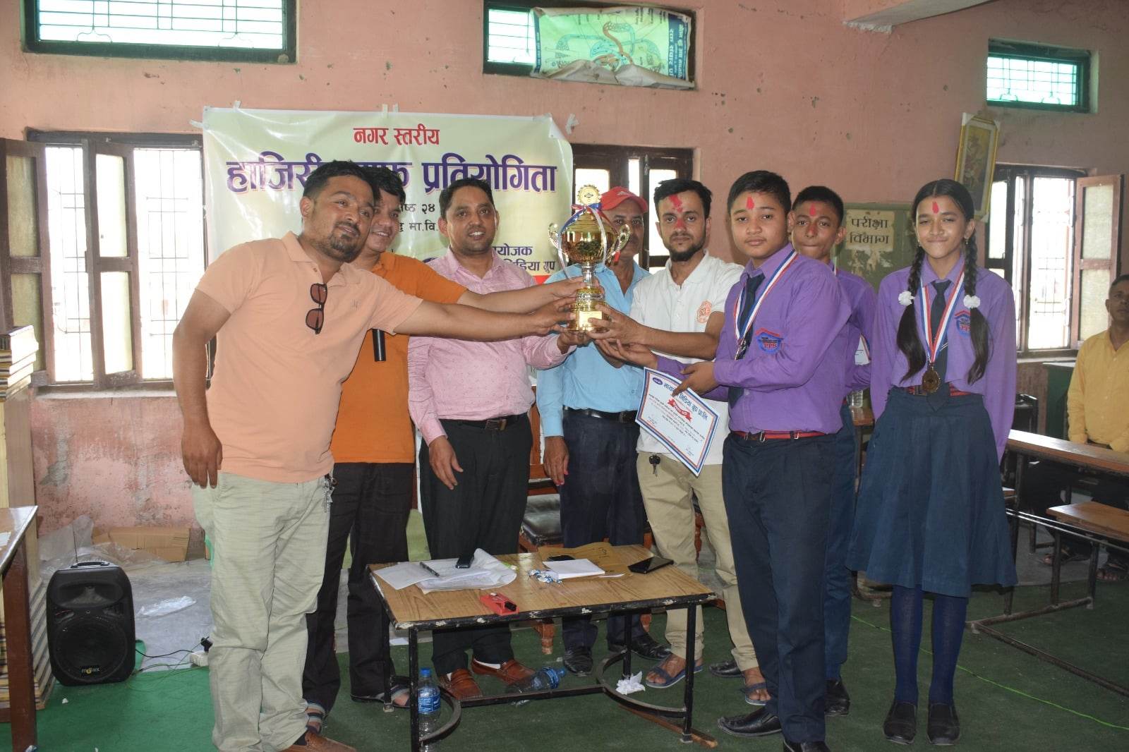 बुधबार गोरुसिंगेस्थित गौतमबुद्ध माध्यमिक विद्यालयमा सन्चालित नगरस्तरीय हाजिरी जवाफ प्रतियोगीताको उपाधि पारीजातले जितेको हो । उपाधि जित्ने पारीजातले नगद पुरस्कारसहित शिल्ड, मेडल र प्रमाणपत्र प्राप्त गरेको छ ।