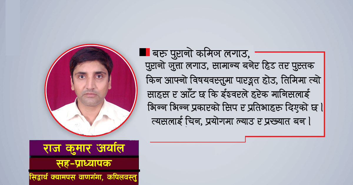 बरु पुरानो कमिज लगाउँ, पुरानो जुत्ता लगाउँ, सामान्य बनेर हिँड तर पुस्तक किन । आफ्नो विषयवस्तुमा पारङ्गत होउँ, तिमीमा त्यो साहस र आँट छ l ईश्वरले हरेक मानिसलाई भिन्न भिन्न प्रकारको सीप र प्रतिभाहरु दिएको छ त्यसलाई चिन, प्रयोगमा ल्याउँ र प्रख्यात बन । सबैको दिमागको तौल औसतमा १००० देखि १५०० ग्राम हुन्छ l ईश्वरले बराबरी दिएर हामीलाई यो धर्तीमा पठाएका छन् l
