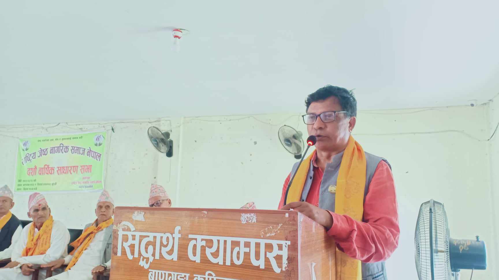 कार्यक्रममा राष्ट्रिय जेष्ठ नागरिक समाज नेपालका केन्द्रीय अध्यक्ष चन्द्रकान्त आचार्यले देश भरका जेष्ठ नागरिकहरुको प्रतिनिधित्व गर्दै कपिलवस्तुमा साधारण सभा गर्न सक्नु ठूलो उपलब्धि भएको बताए । अहिले आफूहरु जस्ता धेरै वृद्धवृद्धा घरवारविहिन भएको भन्दै त्यस तर्फ स्थानीय सरकारदेखि केन्द्र सरकारले तत्काल चासो देखाउनुपर्ने बताए । नेपाली समाजमा पहिला जस्तो जेष्ठ नागरिकले सम्मान पाउन छाडेको भन्दै उनले दुखेसो समेत पोखे ।