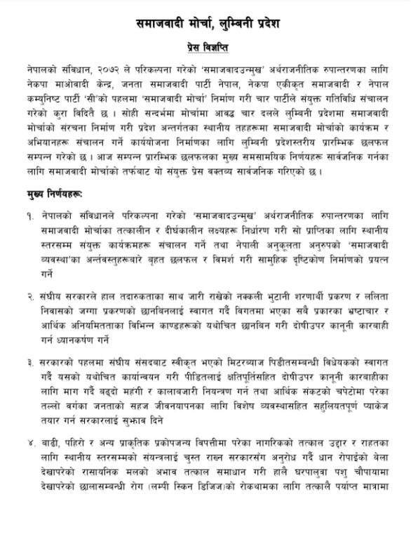 केन्द्रमा समाजवादी मोर्चा बनाएका नेकपा माओवादी केन्द्र, जनता समाजवादी पार्टी नेपाल, नेकपा एकीकृत समाजवादी र विप्लव नेतृत्वको नेपाल कम्युनिष्ट पार्टीले लुम्बिनीमा प्रदेशस्तरीय मोर्चामार्फत काम थालेका छन् ।