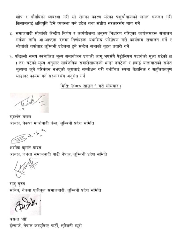 बैठकपछि मोर्चामा रहेको नेकपा माओवादी केन्द्रका प्रदेश अध्यक्ष सुदर्शन बराल, जसपा प्रदेश अध्यक्ष अशोक यादव, नेकपा एसका प्रदेश अध्यक्ष राजु गुरुङ, नेपाल कम्युनिष्ट पार्टीका लुम्बिनी ब्युरो इन्चार्ज बसन्त सीले जारी गरेको सामूहिक विज्ञप्तिअनुसार संघीय सरकारले थालेको भ्रष्टाचारविरोधी अभियानलाई कडाइका साथ लागू गर्न अनुरोध गर्ने, विपत्तिको तयारीका लागि तीनै तहको सरकारलाई आग्रह गर्नेलगायतका निर्णय गरिएको छ ।