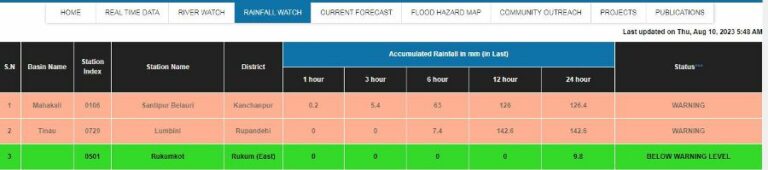 महाशाखाले आज बिहान साढे १ बजे सूचना जारी गरी पछिल्लो ३ घण्टा कञ्चनपुरको शान्तिपुर बेलौरी आसपास क्षेत्रमा अति भारी वर्षामापन भएको र सो क्षेत्र भई बहने सुहेली, चौधर लगायत साना खहरे खोलाहरुमा एक्कासी बाढीको जोखिम रहेको जनाएको छ ।