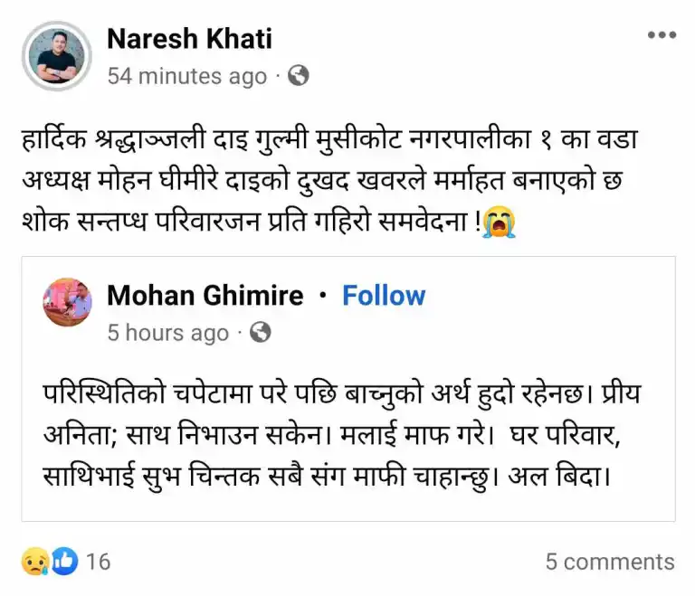 उनको फेसबुकमा लेखिएको थियो, ‘परिस्थितिको चपेटामा परे पछि बाच्नुको अर्थ हुदो रहेनछ। प्रीय अनितास साथ निभाउन सकेन। मलाई माफ गरे। घर परिवार, साथिभाई सुभ चिन्तक सबै संग माफी चाहान्छु। अल बिदा।’