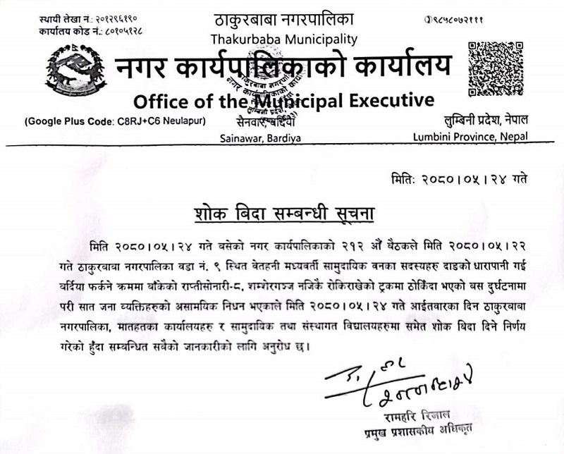 बर्दियाको ठाकुरबाबा नगरपालिकाले आज शोक बिदा दिएको छ ।