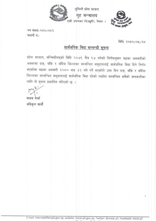 ‘भदौ ३१ गते दाङ, बाँके र बर्दियाका सम्बन्धित समुदायलाई सार्वजनिक बिदा रहेको ब्यहोरा सबैमा जानकारी गराउँदछौँ,’ प्रदेश सरकारका अधिकृत माधव शर्माले बिहीवार जारी विज्ञप्तिमा भनिएको छ ।