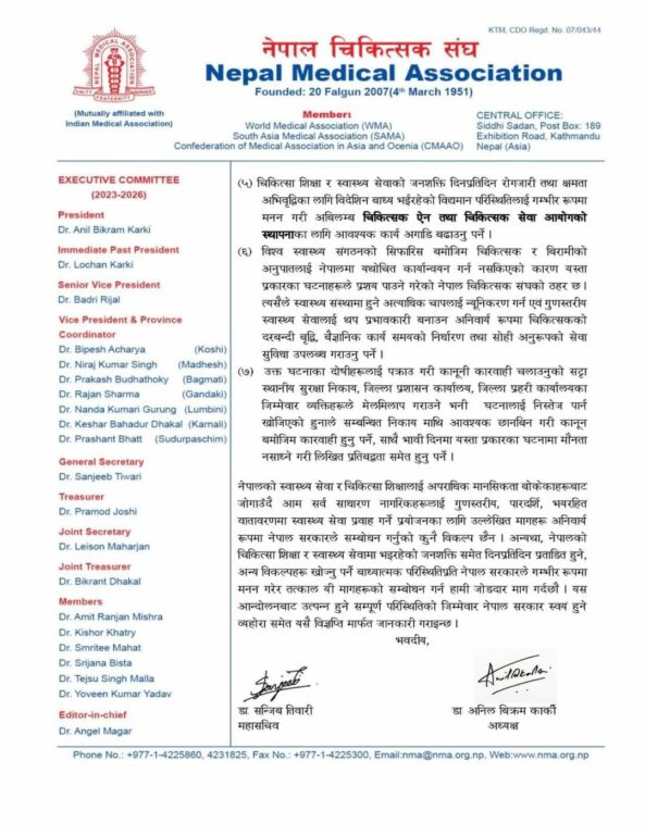 दोस्रोमा हेटौंडा अस्पतालमा भएको घटनामा संलग्न सबै दोषीहरूको छानबिन गरी फौजदारी अभियोग तथा स्वास्थ्यकर्मी तथा स्वास्थ्य संस्थाको सुरक्षा सम्बन्धी पहिलो संशोधन ऐन २०७९ बमोजिम कानुनी कारबाहीको सुनिश्चितता गर्न माग गरेको छ। स्वास्थ्य संस्था सुरक्षाबलको व्यवस्था गरी भयरहित वातावरणमा स्वास्थ्य सेवा प्रवाह गर्ने व्यवस्था अबिलम्ब मिलाउन पनि माग गरेको छ।