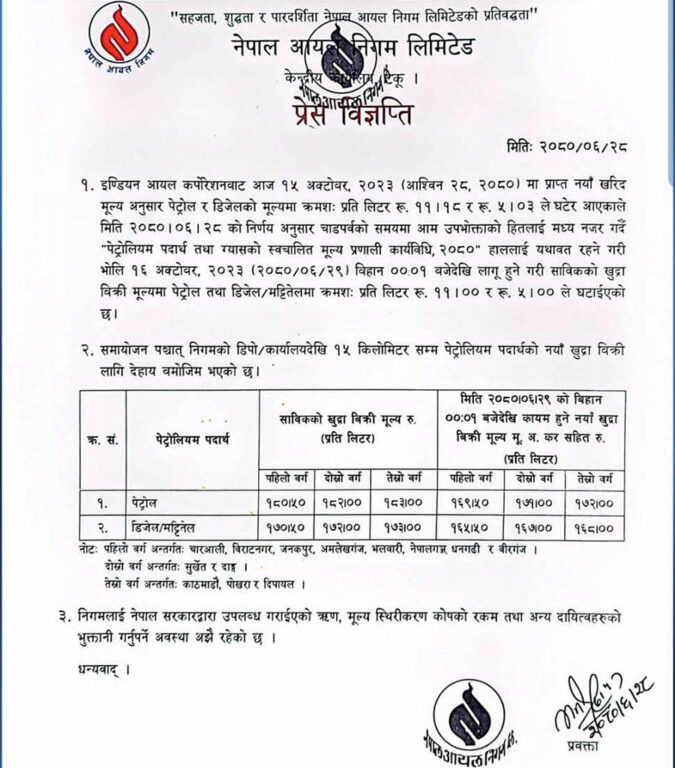 भारतीय आयल कर्पोरेसन ९आईओसी०बाट घटेर नयाँ मूल्य प्राप्त भएका कारण मूल्य समायोजन गरिएको निगमले जनाएको छ ।
