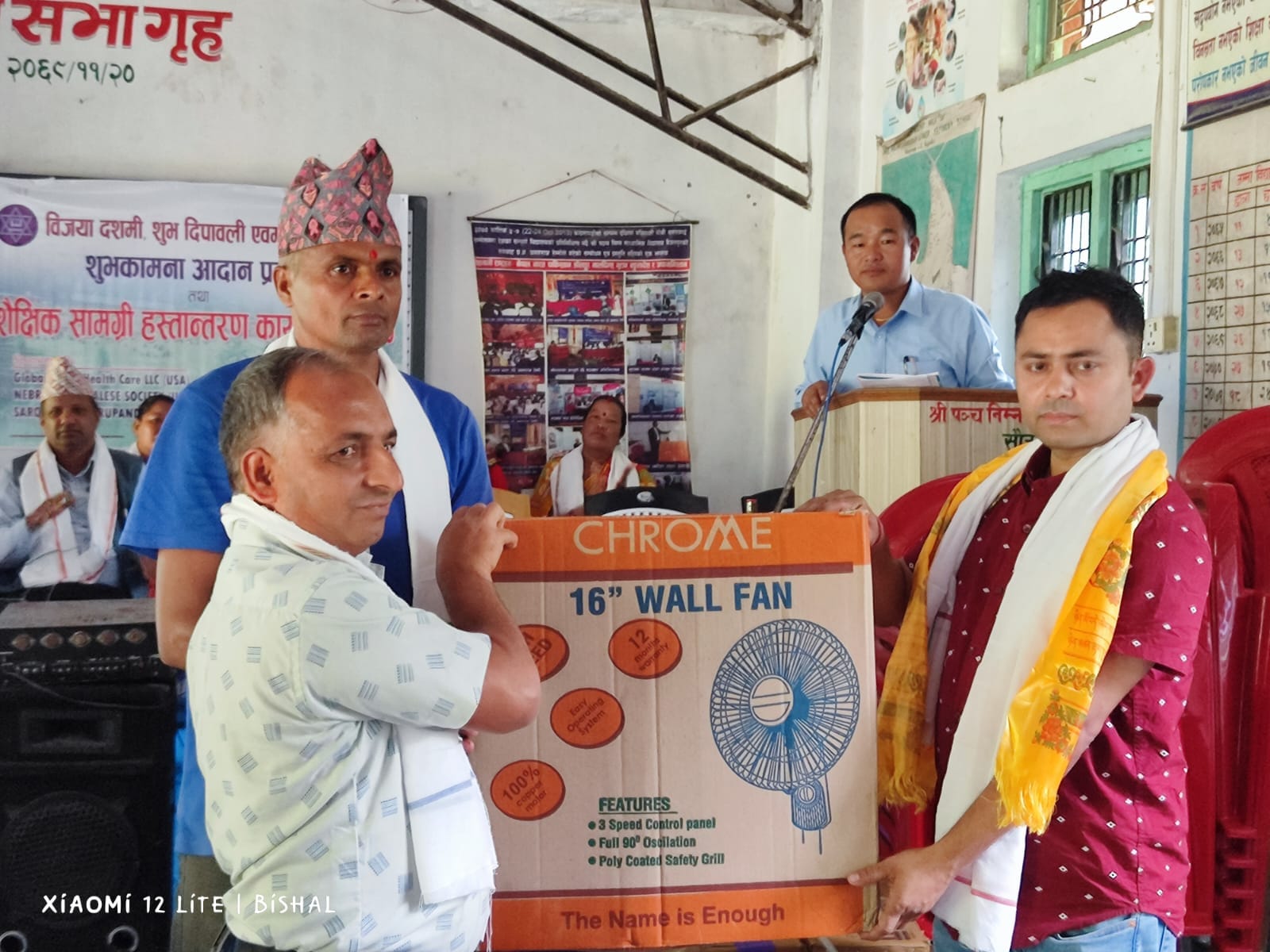 विद्यालयको कार्यालय तथा कक्षा व्यवस्थापनमा प्रत्यक्ष सहयोग पुरयाउन अत्यावश्क सामग्री प्रिन्टर १ थान, सिलिङ प्यान ८ थान, कुर्चि २५ थान, भित्ते पंखा १ थान र स्टेशनरी सामग्री हस्तान्तरण गरिएको हो ।