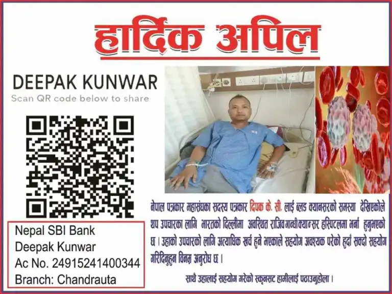 ब्लड क्यान्सर पीडित कपिलवस्तुका पत्रकार दीपक केसीलाई उपचारमा रकम अभाव भएको छ ।