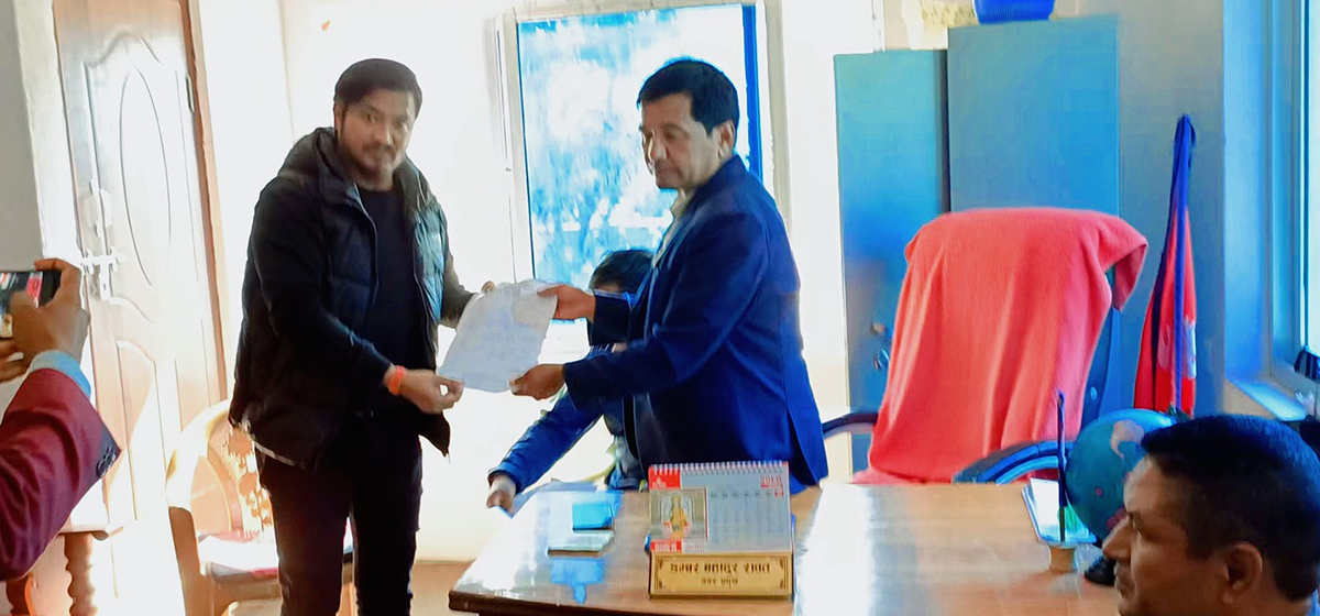 मेयर थापाले नलगाड नगरपालिकाका मेयर डम्मर बहादुर राउतलाई राहत सामग्री हस्तान्तरण गरेको बताए।