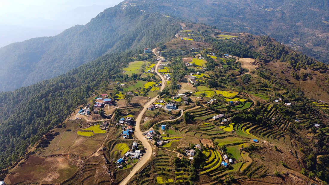 ड्रोन क्यामेराबाट खिचिएको सुर्खेतको वीरेन्द्रनगर नगरपालिका–१४ स्थित गोठीकाँडा क्षेत्रको दृश्य। यो वीरेन्द्रनगरको प्रमुख पर्यटकीय क्षेत्र हो भने सिंजा राज्य हुने बेलाको प्रशासनिक केन्द्र समेत भनेर चिनिन्छ । तस्बिर : सुरेश आचार्य/रासस ।