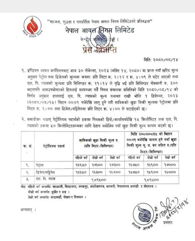 शुक्रवार बिहान १ बजेदेखि लागू हुने गरी निगमले पेट्रोलमा प्रतिलिटर दुई तथा डिजेलरमट्टीतेलमा प्रतिलिटर चार रुपैयाँले घटाएको हो ।