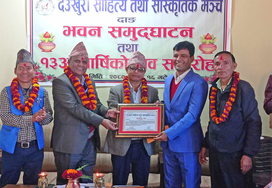 देउखुरी साहित्य तथा सांस्कृतिक मञ्च दाङले पाँच श्रष्टालाई सम्मान गरेको छ । दाङको लमहीमा शनिबार आयोजित मञ्चको १३ औं वार्षिक उत्सवको समारोहमा श्रष्टाहरुलाई सम्मान गरिएको हो ।