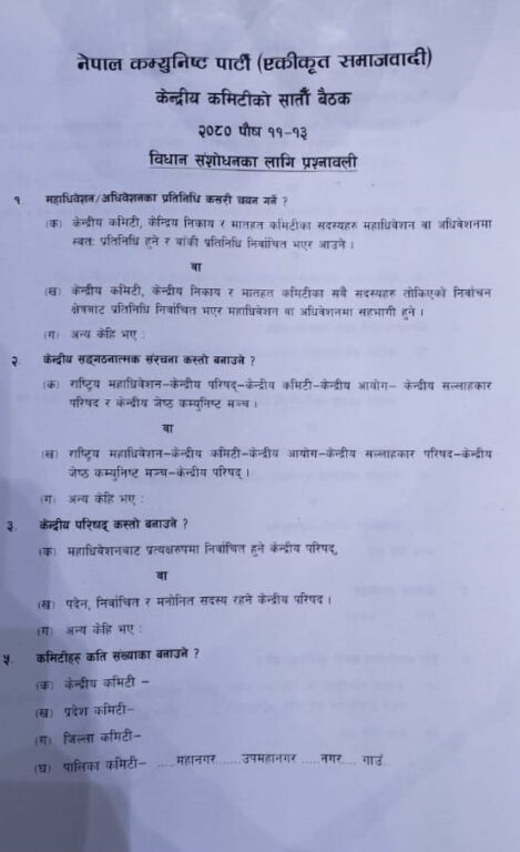 पार्टीको विधान संशोधनमा महाधिवेशन/अधिवेशन प्रतिनिधि प्रत्यक्षबाट चयन गर्ने कि नगर्ने ? केन्द्रीय संरचना कस्तो बनाउने ? केन्द्रीय कमिटीको संख्या कति बनाउने लगायत प्रश्नावली तल्ला समितिमा पठाएको प्रचार विभाग प्रमुख जगन्नाथ खतिवडाले बताए । ‘प्रदेश, जिल्ला र स्थानीय समितिबाट सुझाव आएपछि विधानलाई अन्तिम रुप दिइने छ’ उनले भने ।