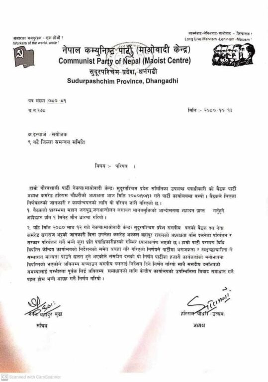 माओवादी केन्द्र सुदूरपश्चिम प्रदेश समितिका अध्यक्ष हरिराम चौधरी र सचिव जनकबहादुर बुढाको संयुक्त हस्ताक्षरमा जारी विज्ञप्तिमा भनिएको छ, ‘माघ १२ गते नेकपा माओवादी केन्द्र सुदूरपश्चिम प्रदेश संसदीय दलको बैठक दल नेता कमरेड खगराज भट्टको जानकारीबिना उपनेता कमरेड अक्कल बहादुर रावलको अध्यक्षतामा बसी दलनेता परिवर्तन र सरकार परिवर्तन गर्ने भन्ने कुराप्रति पदाधिकारीहरूको गम्भीर ध्यानाकर्षण भएको छ। हाम्रो पार्टी परम्परा–विधिविपरीत केन्द्रीय कार्यालयको निर्देशनको समेत अवज्ञा गरी गरिएको निर्णयले पार्टीमा अराजकता र स्वेच्छाचारीताले संस्थागत मान्यता पाउने खतरा हुने भएकोले संसदीय दलको यो निर्णय पार्टीका हजारौँ कार्यकताका मनोभावना विपरीतको भएकोले अविलम्ब सच्याउन संसदीय दललाई निर्देशन दिने निर्णय गरियो। साथै संसदीय दलको समस्यालाई गम्भीरतापूर्वक लिई अविलम्ब समाधानको लागि केन्द्रीय कार्यालयको उपस्थितिमा विवाद समाधान गर्ने पहल होस भन्ने आग्रह गर्ने निर्णय गरियो।’