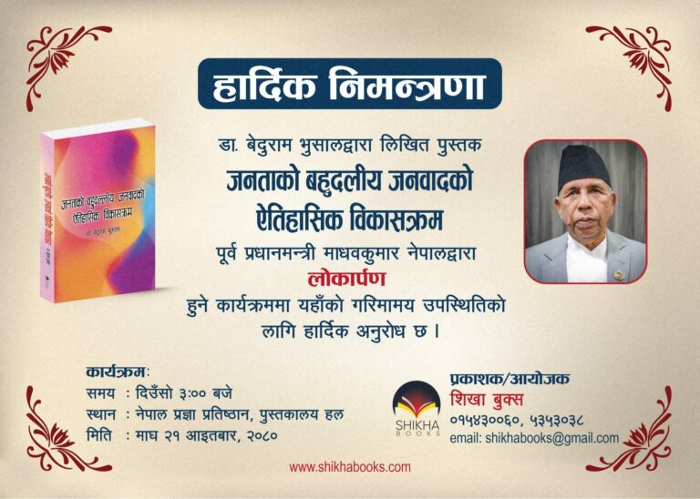 शिखा बुक्सले बजारमा ल्याएको पुस्तकको लोकार्पण नेकपा (एकीकृत समाजवादी)का अध्यक्ष एवंम् पूर्व प्रधानमन्त्री माधव कुमार नेपालले गर्ने कार्यक्रम छ ।