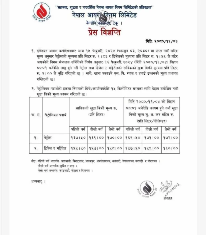 निगमले बिहीबार एक विज्ञप्ति जारी गरी पेट्रोल, डिजेल र मट्टीतेलको लिटरमा दुई–दुई रूपैयाँ बढेको जानकारी दिएको छ । निमगका अनुसार खाना पकाउने ग्यास र हवाइ इन्धनको मूल्य भने यथावत राखिएको छ ।