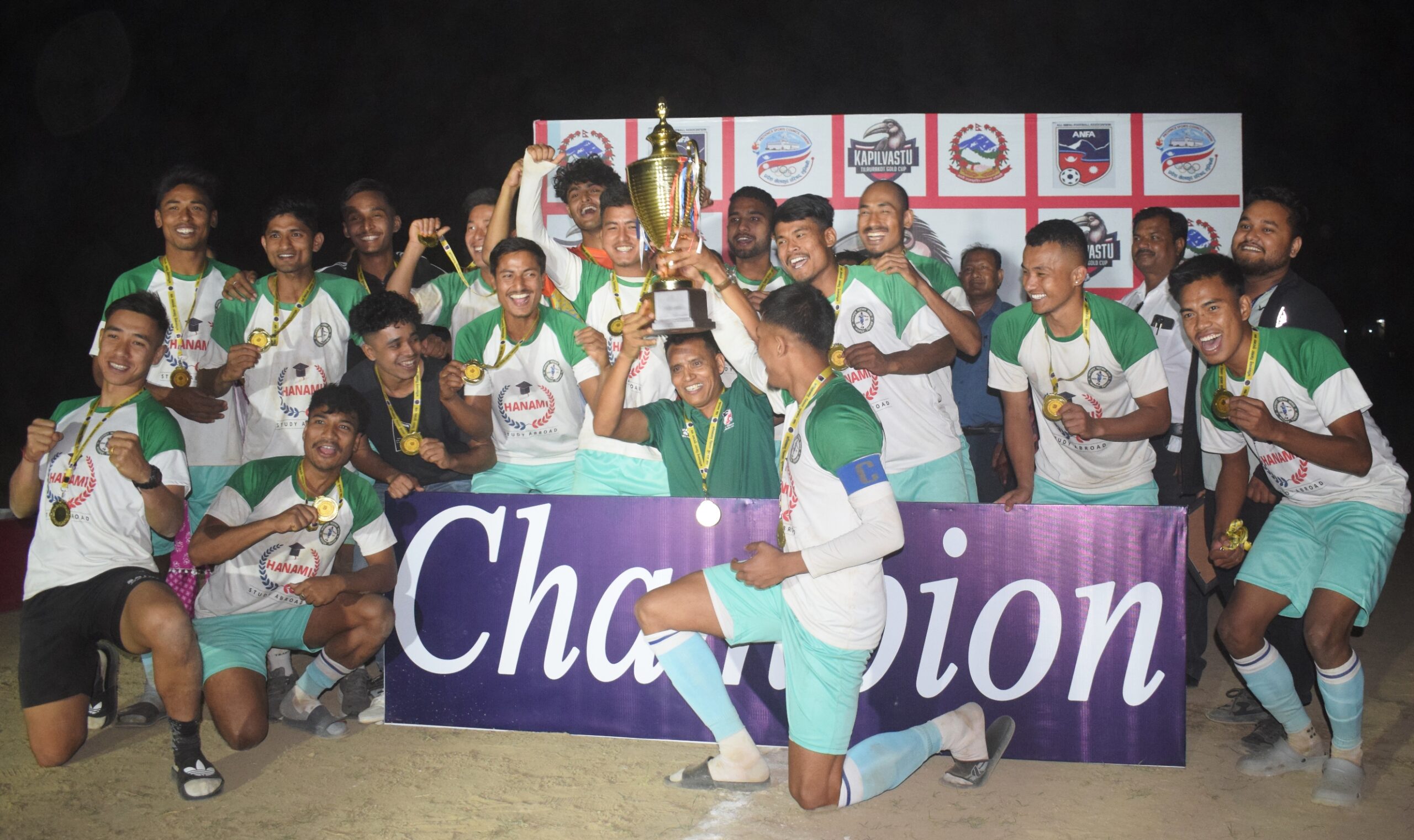 बाणगंगा । विभागीय टोली नेपाल पुलिस क्लवलाई पराजित गर्दै हनामी बीएफसी चितवन प्रथम तिलौराकोट गोल्डकपको च्याम्पियन बनेको छ । कपिलवस्तुको बाणगंगास्थित बुद्ध रंगशालामा भएको शनिबारको उपाधी भीडन्तको निकै रोमाञ्चक खेलमा चितवनले पुलिसमाथि टाई ब्रेकरमा ४-३ गोल अन्तरको जित हासिल गरी च्याम्पियन बनेको हो ।