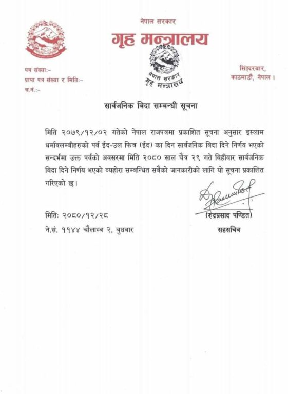 इस्लाम धर्मालम्बीहरुको पर्व ईद उल फित्र ( इद ) को अवसरमा सार्वजनिक विदा दिने निर्णय भएको गृह मन्त्रालयद्वारा जारी सूचनामा भनिएको छ ।