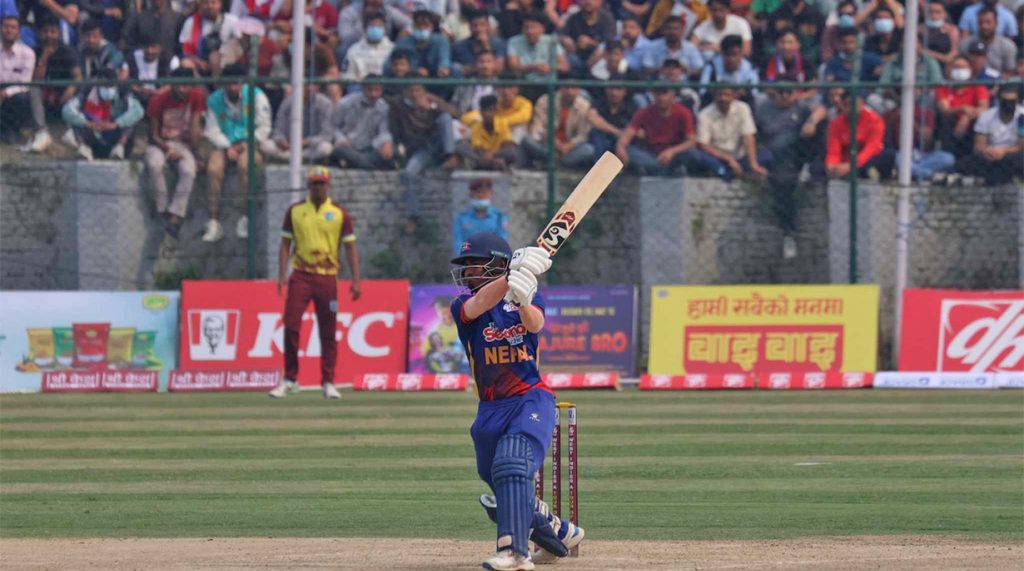 रोहित पौडेल ५४ बलमा १० चौका र ६ छक्कासहित ११२ रनको शतकीय इनिङ खेले । नेपाललाई ८ बलमा १३ रन चाहिँदा रोहित म्याथ्यु फर्डको बलमा विकेटकिपर आन्द्रे फ्लेचरबाट क्याच आउट हुन पुगेका थिए ।