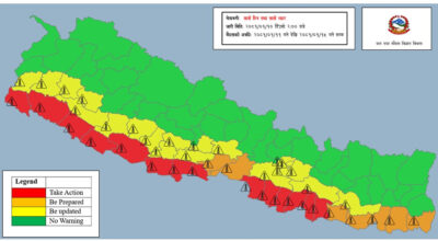 काठमाडौं ।मौसम पूर्वानुमान महाशाखाले नेपालको तराई क्षेत्रमा चार दिनसम्म तातो हावा चल्नसक्ने बताएको छ ।