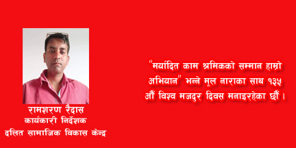 हाम्रो देश नेपालमा सन् १९६३ देखि अन्तर्राष्ट्रिय श्रमिक दिवस मनाउदै आइएको छ। तर यस दिनलाई वि. सं. २०६४ देखि मात्र आधिकारिक सार्वजनिक विदाको रूपमा घोषणा गरियो। सरकारी स्तरबाट नै समुदाय सम्म मजदुर दिवसको बारे पुग्न सकेको छैन । दलित महिला र सोही स्तरमा काम गर्ने सामाजिक सघ सस्थाले मात्र आयोजना गरेको देखिन्छ ।  यो कार्यक्रम गाउँ समुदाय स्तरमा सवै पालिका र वडा कार्यालय लगायत सामाजिक संघ संस्थाले मजदुरहरुको सम्मान गर्ने पुरस्कार दिने र वहाँहरुको हक अधिकारको लागि सम्पूर्णमा जानकारी दिने समेत कार्य गर्नु पर्ने हुन्छ ।