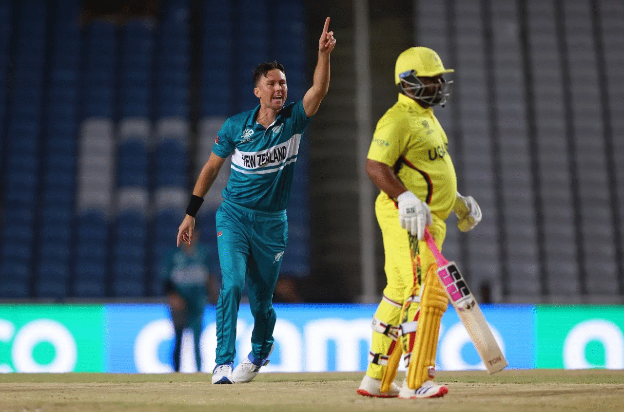 यसअघि टिम साउथीले ३ तथा ट्रेन्ट बोल्ट, मिेचल स्यान्टनर र रचिन रवीन्द्रले २–२ विकेट लिए भने युगान्डा १८.४ ओभरमा मात्र ४० रनमा समेटिएको थियो ।