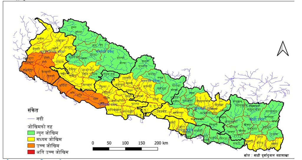 झापा, मोरङ, सुनसरी, बारा, पर्सा, मकवानपुर, सिन्धुपाल्चोक, दोलखा, चितवन, कास्की, बागलुङ, पर्वत, स्याङ्जा, म्याग्दी, नवलपरासी पूर्व र आसपासका जिल्ला भई बग्ने नदी तथा खोलाहरुमा आकस्मिक बाढीको मध्यम जोखिम छ ।