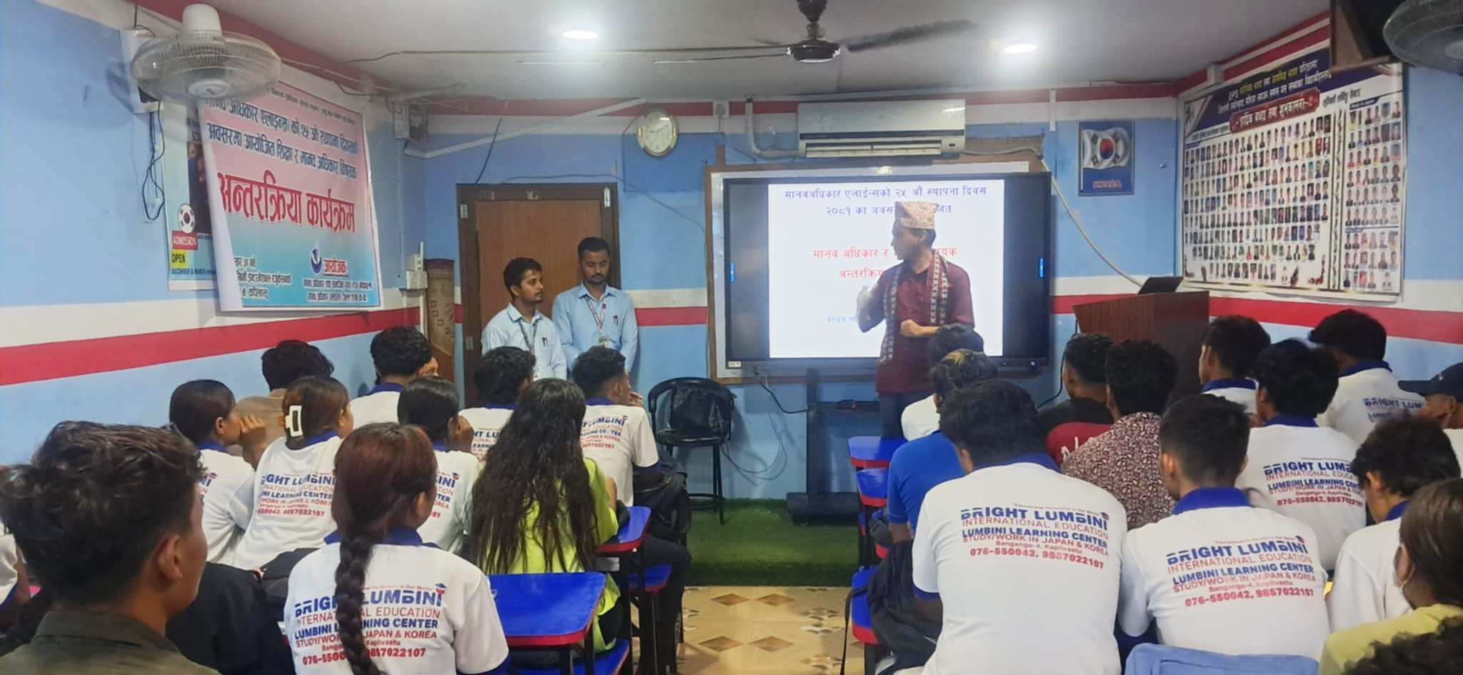 कार्यक्रम ब्राईट लुम्बिनी ईन्टरनेशनल एजुकेशनको सभाहलमा आयोजना गरिएको थियो । त्यहाँ अध्ययनरत विद्यार्थीहरुले शिक्षा र मानव अधिकार बिषयक अन्तरक्रिया कार्यक्रममा विभिन्न जिज्ञासा राख्नुभएको थियो भने जसको सम्बोधन केन्द्रिय सचिव घिमिरेले गर्नुभएको थियो ।
