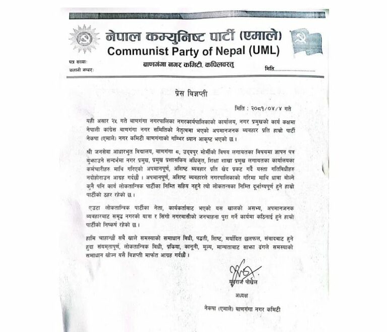 एमाले बाणगंगा नगर कमिटी अध्यक्ष युवराज पोख्रेलद्धारा हस्ताक्षरित विज्ञप्तिमा- ‘यही असार २५ गते बाणगंगा नगरपालिका नगरकार्यपालिकाको कार्यालय, नगर प्रमुखको कार्य कक्षमा नेपाली कांग्रेस बाणगंगा नगर समितिको नेतृत्वमा भएको अपमानजनक ब्यवहार प्रति नेकपा ९एमाले० नगर कमिटी बाणगंगाको गम्भीर ध्यान आकृष्ट भएको छ । श्री जनसेवा आधारभुत विद्यालय, बाणगंगा ८, उद्यपुर मोर्मीको विषय लगायतका विषयमा ज्ञापन पत्र बुझाउने सन्दर्भमा नगर प्रमुख, प्रमुख प्रशासकीय अधिकृत, शिक्षा शाखा प्रमुख लगायतका कार्यालयका कर्मचारीहरुमाथि गरिएको अपमानपूर्ण, अशिष्ट ब्यवहार प्रति खेद प्रकट गर्दै यस्ता गतिविधीहरु नदोहोराउन आग्रह गरिएको छ ।’