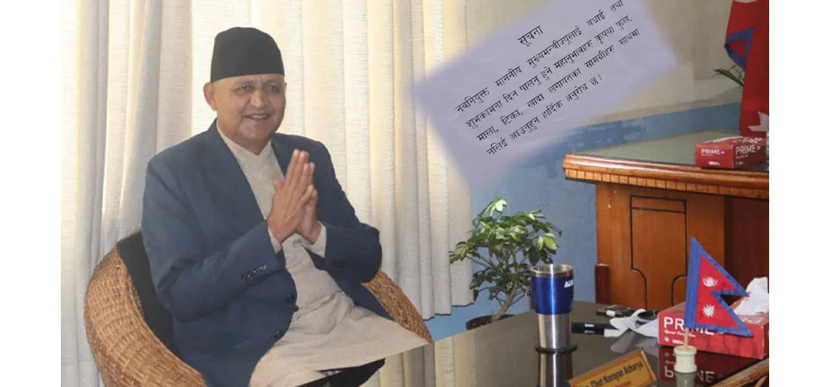 मुख्यमन्त्री तथा मन्त्रिपरिषद कार्यालयमा उनको सचिवालयले खादा, माला, अबिर नलगाउन निषेध गरेको सूचना टाँस गरेको मुख्यमन्त्री सचिवालयका प्रदीप नेपालीले जानकारी दिए।
